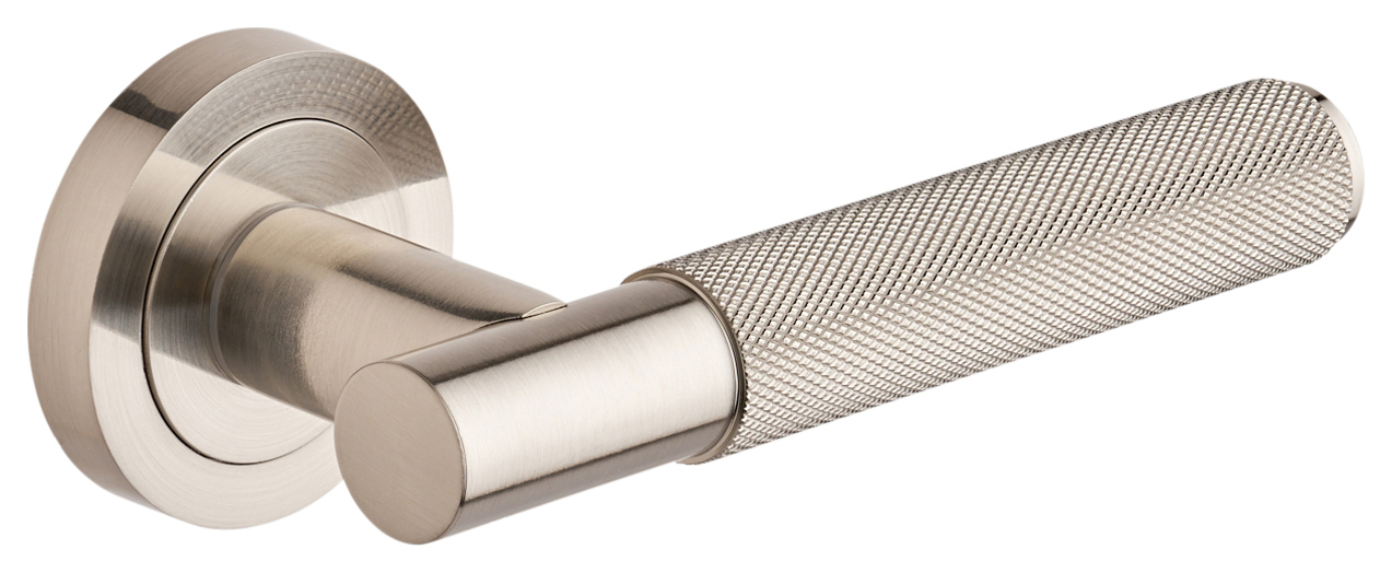 Marylebone Lever on Rose Brushed Nickel Knurled Door Handle - 1 Pair - Featuring simple, elegant lines and a knurled grip, this lever on rose handle adds a beautiful detail to any space. Its versatile design is perfect for both home and commercial settings, offering a touch of sophisticated style.
