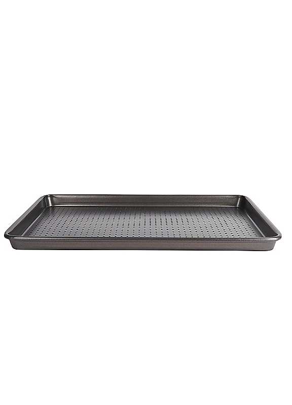 This MasterClass Crusty Bake Non-Stick Baking/Cookie Tray lets you bake crispier cookies, crumblier biscuits, golden oven chips and pizza - with no more soggy bottoms! Ideal for everyday use, it's made from heavy duty materials with the award-winning* Crusty Bake collection's clever perforated, non-stick design. Built to last, this baking tray is covered by the MasterClass 20-year guarantee and 5-year non-stick guarantee.CRISP UP YOUR COOKING: this baking tray's perforations circulate hot air for a super-crispy textureAN ALL-ROUNDER: use it for crispy cookies, oven chips, rectangular pizzas & much moreQUANTUM II NON-STICK: it releases bakes easily, thanks to this innovative, BPA-free double non-stick coatingRECOGNISED QUALITY: this baking tray is part of MasterClass's multi-award-winning Crusty Bake collection