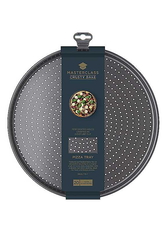 With this 32 cm (12½ inch) Non-Stick Pizza Pan/Crisper from the multi award-winning* MasterClass Crusty Bake collection, you can complement the perfect topping with the perfect crispy base. It's ideal for giving freshly made and frozen pizzas a lovely, evenly baked finish - with no more soggy bottoms! You can also use it to bake bruschetta, warm flatbreads and cook oven chips. Built to last, this pizza pan is covered by the MasterClass 20-year guarantee and 5-year non-stick guarantee.GOURMET PIZZA AT HOME: this pan has tiny holes that circulate air for added crispnessVERSATILE: it's big enough for a 12-inch pizza, & great for crispy chips or bruschettaQUANTUM II NON-STICK: it releases pizzas easily, thanks to this innovative, BPA-free double non-stick coatingRECOGNISED QUALITY: this pizza crisper is part of MasterClass's multi-award-winning Crusty Bake collection