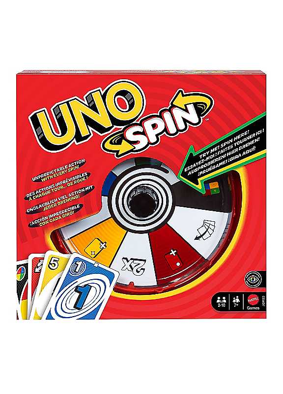 UNO Spin puts a different spin on Classic UNO gameplay that's fun for everyone! Players take turns playing their UNO cards by matching the colour, number or action to get rid of all their cards. When a spin card is played, that player must spin the wheel, then follow the action. Different spin powers like Colour Draw, Swap Hands, Colour Discard or Double Spin can be real game-changers especially if someone forgets to yell 'UNO!' Includes 112 cards and 1 spinner. Colours and decorations may vary.Age suitability: 7 years+Not suitable for children under 3 years old. | family party games, games for 2 people, party games for adults, fun group games, uno party, family card games, uno cards