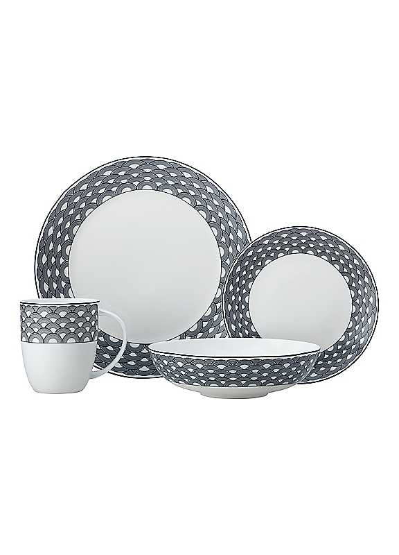 The Harlequin black and white dinner set is inspired by the elegance and decadence of the Roaring Twenties. It showcases a black geometric border pattern, with white porcelain as its backdrop, creating a beautiful and eye-catching frame for your food. Rely on this dining set when you want to make a statement. With four dinner plates, four side plates, four bowls and four coffee mugs, it features everything you need for a four-person dinner service. The mugs, plates and bowls are made of high-quality porcelain, so they're suitable for everyday dining too.A COMPLETE CROCKERY SET FOR 4: Harlequin includes 4 dinner plates (27.5 cm), 4 side plates (19 cm), 4 bowls (19 cm) & 4 mugs (400 ml)ART DECO ELEGANCE: Inspired by the Roaring Twenties, Harlequin features a patterned border that frames your food in stunning styleHIGH QUALITY PORCELAIN: This dinner crockery is robustMAKE A STATEMENT: With black edging against neutral white, Harlequin stands out at parties & pairs well with White Basics dinnerwareGIFT BOXED: Designed in Australia by Maxwell & Williams, this dining set comes securely packaged in an attractive gift boxDishwasher & Microwave safe