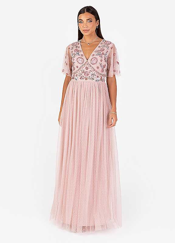 Renowned for their use of intricate embellishment and soft fabrics Maya designed yet another style that doesn't fall far from spectacular. Meticulously placed sequin and beads form floral motifs that elegantly adore the V neck bodice and sheer short sleeves. Spot mesh tulle continues to fall into an A-line silhouette that's comfortable for all body shapes leaving plenty of room to dance the night away. It's Pink shade makes this maxi dress a versatile piece so you can wear it again and again. Style with Pink accessories for a summer's day wedding or opt for shimmering silver jewellery and strappy heels for an evening soiree.Hand wash only100% Polyester