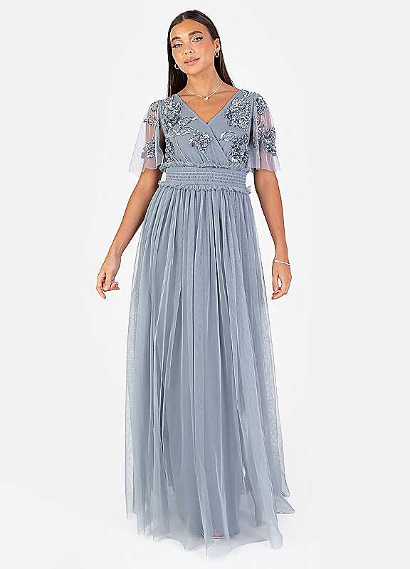 Elevate your occasion wardrobe with this show-stopping maxi dress from Maya Deluxe. This dusty blue dress features delicate floral motifs meticulously hand-sewn with shimmering beads and sequins adorning the faux wrap V-neck bodice and sheer short sleeves for an elegant finish. Designed with a shirred elasticated waist it accentuates an effortlessly flattering A-line silhouette making it the perfect choice for all body shapes. Ideal for bridesmaids or special occasions this maxi dress pairs beautifully with barely-there heels and dainty earrings for an unforgettable look.Hand wash only100% Polyester