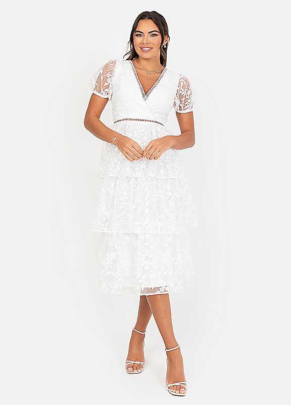Elevate your moment with this white midi dress a testament to romance and refined craftsmanship. This piece is delicately outlined with lace trims gracefully defining the faux wrap front and waist for a flattering silhouette. The ethereal organza overlay serves as the perfect canvas for intricate floral embroidery cascading seamlessly from short puffed sleeves to the tiered skirt. Crafted with three ruffled layers the voluminous skirt offers an enchanting sense of movement while the structured organza ensures a pristine sculptural shape. Perfect for contemporary brides this dress pairs beautifully with diamant© heels and statement hair bow.Hand wash only100% Polyester
