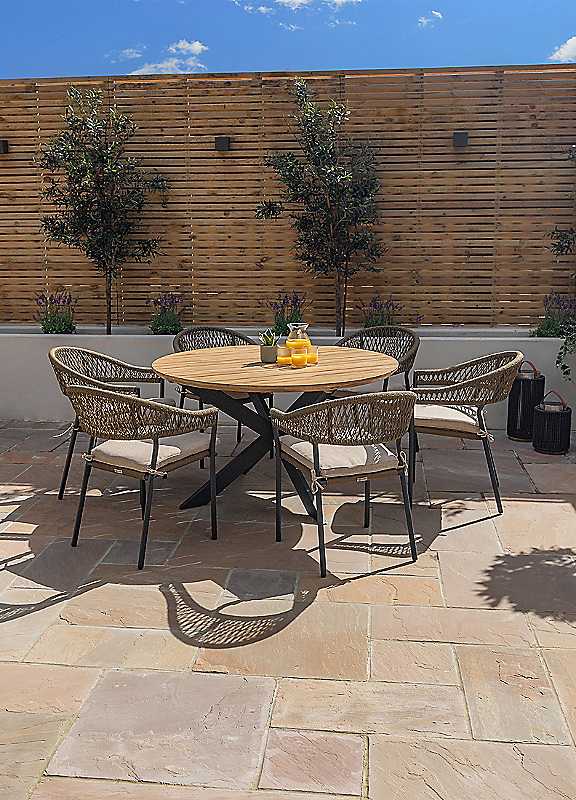 Perfect for family meals and social gatherings, the Bali 6-Seater Dining Set combines contemporary style with timeless charm. This set includes 6 stackable chairs with a gently curved design, slender dark grey powder-coated legs, and woven olive-green rope detailing. Each chair comes with an oatmeal tie-back cushion, offering comfort and style for long, leisurely meals. The dining table features a 135cm diameter round top made from sustainably sourced acacia wood, designed to evoke the elegant lines of a yacht deck. Its crossover metal frame base adds a modern touch while providing stability and durability, creating a set that perfectly balances classic craftsmanship with contemporary design.What's included:1x Round Dining Table 140 x H76cm6x Dining Chairs - W57 x D67 x H82cmSeat Height - 46cmSturdy aluminium powder coated RAL 7016 grey frameSolid FSC Acacia Wood TabletopsTable requires assembly (approximately 25 minutes)Olive Green Round Woven Polypropylene Rope100% Olefin Weatherproof cushions