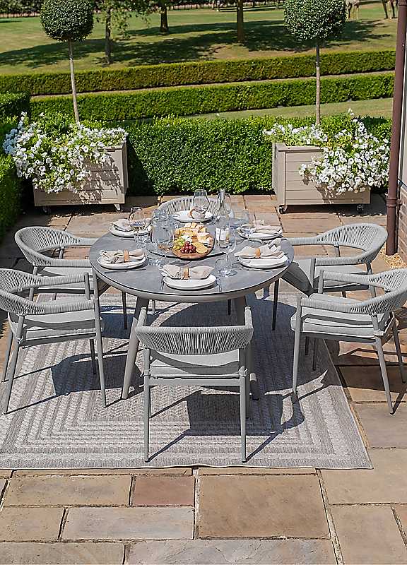 Transform your outdoor dining experience with the Maze Florence Rope Weave 6 Seat Oval Dining Set. This elegant set features a beautifully crafted ceramic oval table adorned with a 50cm removable Lazy Susan, making sharing meals effortless and enjoyable. Each of the six chairs is designed with natural linen cushions made from polyester fabric, and a modern waterproof rope weave providing both comfort, durability, and style. The piped edge gives this versatile cushion a sophisticated finish. The rope weave design and natural tones create a warm, inviting atmosphere, perfect for everything from casual brunches to intimate dinners. Crafted with polyester fabric, the cushions offer exceptional durability and resistance to stains and fading, ensuring long-lasting use. Their lightweight design allows for easy rearrangement, while the quick-drying properties make them suitable for various weather conditions, making this set a practical choice for any setting. During winter months, we recommend that that cushions are stored away or covered.What's included:1x Oval Dining Table W120 x L180 x H75cm1x Lazy Susan - 50 cm6x Dining Chairs - W56 x D62 x H76cm All-Weather Hydrophobic Rope WeaveSeat cushion made with UK FR FoamCushion Material - Solution Dyed Polyester FabricSeat Cushion Thickness - 5cmStackable Dining ChairsFrame - Dawn Grey Powder Coated Aluminium Table supplied with Lazy Susan