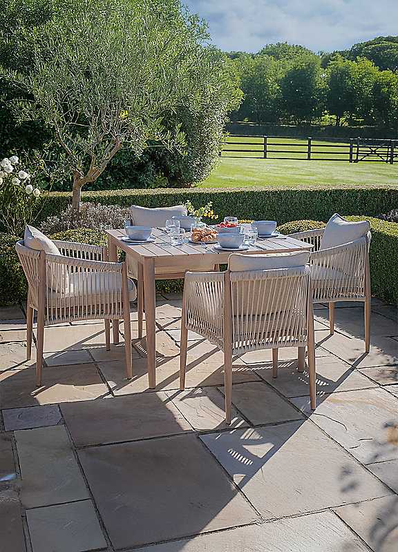 Transform your alfresco experience with the Maze Havana 4 Seat Square Dining Set, with a laid-back sophistication teamed with contemporary design. This beautiful set includes four dining chairs which boast a curved back design for extra comfort and a luxurious aesthetic. At the centre of this set is a sleek square slatted aluminium dining table, providing both enduring strength and stylish appeal. The heat transfer wood wrap finish across the frames adds a warm appearance of natural wood, whilst providing a low maintenance that's also long lasting. Combined with plump natural linen-coloured cushions, this set provides both style and comfort, ideal for any outdoor space. Whether you are hosting a family meal or a quieter evening for two at home, the Maze Havana 4 Seat Square Dining Set will lift your outdoor area into an inviting haven. The Maze Havana Rope Weave garden furniture collection beautifully lends itself to both outdoor and indoor spaces such as conservatories, orangeries, and garden rooms. Each piece features small protective feet to protect your flooring whether that's inside or outside.What's included:4x Dining Chairs W62.5 x D51.5 x H77cmSeat Cushion Thickness - 6cmBack Cushion Thickness - 16cmFloor to top of Seat Cushion - 52cm1x Small Square Dining Table W100 x D100 x H75cmNatural linen round woven polypropylene ropeCushion Material - Solution Dyed Polyester FabricFrame - Heat Transfer Wood Effect on AluminiumShower Resistant CushionsStain Resistant Cushions