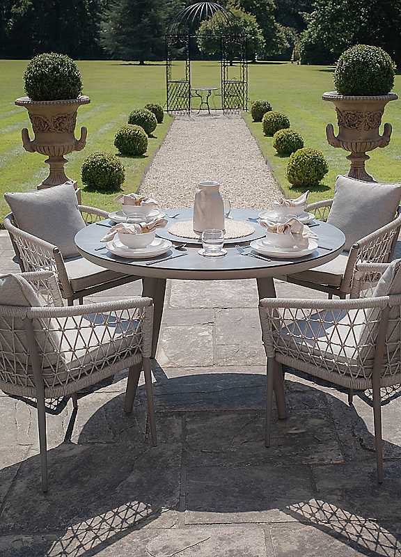 Transcend alfresco dining standards with the luxurious Monaco 4 Seat Round Dining Set with Lazy Susan in Ivy Green. Whether you're having a simple meal or hosting friends and family, this set allows you to impress without stress as the Maze Monaco range applies a laid-back sophistication to functional garden furniture. At the heart of the set is a round table with tempered glass table-top featuring a refined design of marble ceramic nestled between four comfortable dining chairs. The robust powder coated aluminium framework intricately wrapped in woven all weather rope that can be left outside all year round whatever the weather. In addition, we have a matching Lazy Susan in the centre of the table to allow you to share food or condiments with ease. The plump cushions with high performance polyester materials are not only shower, stain, and water-resistant, but they are also beautifully crafted in a colourway to complement the rope detailing, allowing you to sink into a blissful day or evening enjoying your furniture in style. Each piece is fitted with small protective feet, keeping your flooring safe both inside and outside whether that's an orangery, conservatory, or modern garden room.What's included:1x Round Dining Table 120cm x 75cmSeat Cushion - 6cm1x Lazy Susan 50cm4x Dining Chairs W59 x D64 x H74cm Natural Linen round woven polypropylene ropeCushion Material - Solution Dyed Polyester FabricFrame - Dawn Grey Powder Coated AluminiumTabletop - Ceramic Glass (Marble Effect) Shower Resistant Cushions Stain Resistant Cushions