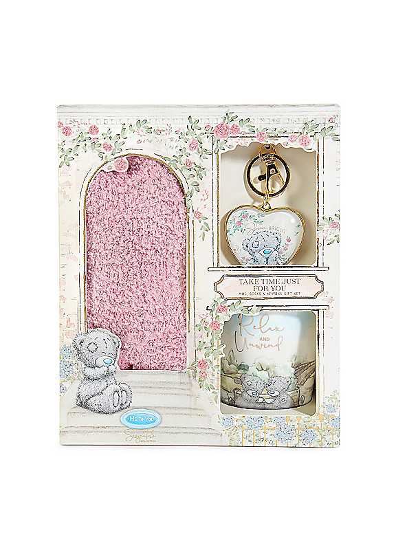 Surprise someone special with this gorgeous Me to You gift set featuring a pair of fluffy socks, a Tatty Teddy mug and a cute little keyring. The pink socks are one-size-fits-all and they're perfect for snuggly nights at home or in bed. The sweet heart-shaped keyring is decorated with adorable Tatty Teddy artwork and the caption 'Shine Bright', while the ceramic mug depicts two Tatty Teddy bears sharing tea on a park bench, and the caption 'Relax and Unwind'. Perfect for birthdays, Get Well, Thinking of You or Just Because, this lovely gift set is presented in an illustrated Signature Collection gift box to give an extra special luxury touch.