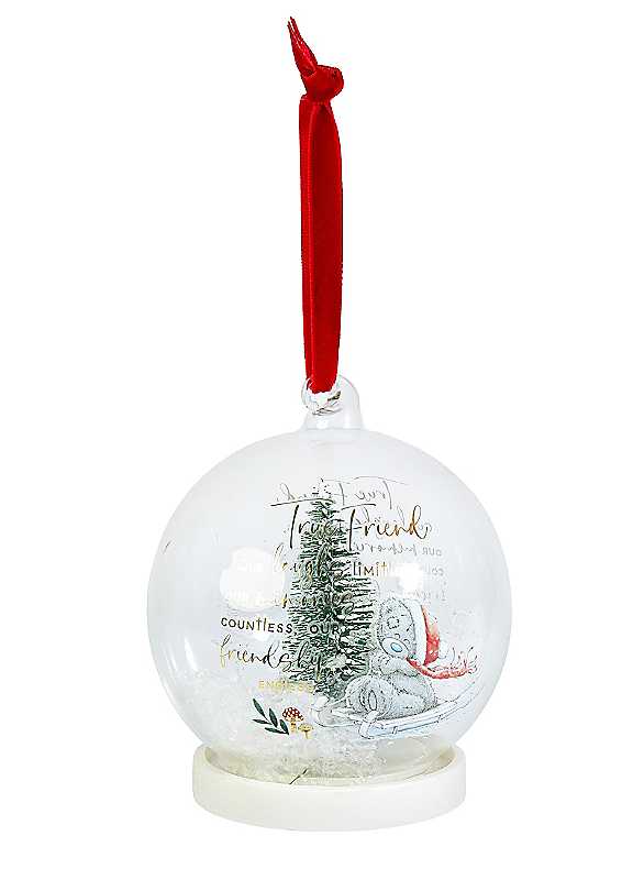 This eye-catching bauble will look wonderful on the Christmas tree with its luxury red hanging ribbon, adorable Tatty Teddy illustration and heartfelt caption to celebrate the joys of true friendship. It's a lovely, thoughtful Christmas gift for a friend who has been there for you all through the year.The spherical glass bauble contains an image of Tatty Teddy on a sled; gentle shake the glass to create a magical snowstorm effect. Printed in gold foil on the outside of the bauble are the words 'True friend our laughs limitless, our memories countless, our friendship endless'. Your friend will be thrilled to receive this gorgeous bauble which comes presented in a luxury Signature Collection gift box. Crafted with love and care from premium materials, Me to You gifts add a touch of festive fun at this magical time of the year.