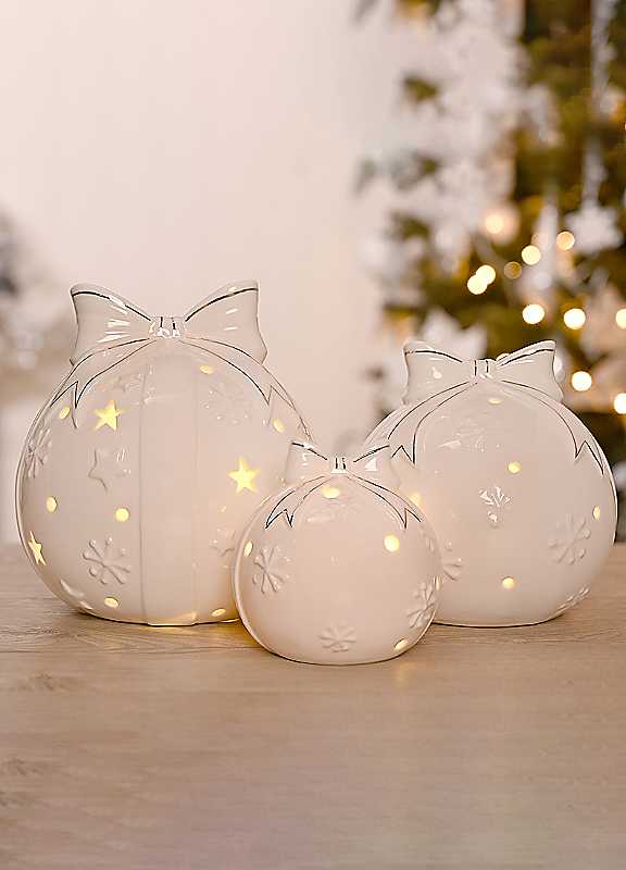 Introducing the 15cm LED Porcelain Bauble, combining elegance and festivity. This ornament brings a cosy glow to any room. The LED light illuminates intricate star and snowflake cut-outs, creating an enchanting atmosphere and warmth during the winter season. Made from off-white ceramic with gold detail and features a charming bow on top Contains cut-out stars and snowflake designs.Indoor use onlyRequires 3 x LR44 batteries (not included)Dimensions approx. 15H x 13W x 13D cm