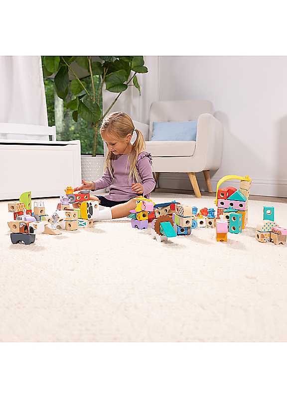 Melissa & Doug BlockablesTM are connectable, stackable, and playable! The solid wood connect-and-play building blocks are perfect manipulatives to help pre-schoolers two and older boost developmental skills (fine motor, problem-solving, matching, storytelling, and self-esteem), while using their imaginations and having fun. Easy-to-grasp smooth, colourful wooden blocks fit together in a snap with large connectors that even little hands can push in and pull out.An illustrated guide shows how to arrange and link the BlockablesTM to create multi-textured farm animals and equipment (a tractor and trailer, cow with felt horns, sheep, pig, horse, chicken with felt wings, food, and a hay bale), or kids can use their imaginations to mix, match, and combine pieces to make unique creations and play their own way! Kids can easily expand their collection - the 56-piece Farm Play Set is compatible with all other BlockablesTM play sets. The packaging folds out to convert into a fun play space and pieces store in the sturdy corrugated box with a soft handle for easy clean-up and portability. Patent pending.Age suitability: 3 years+Not suitable for children under 3 years old.