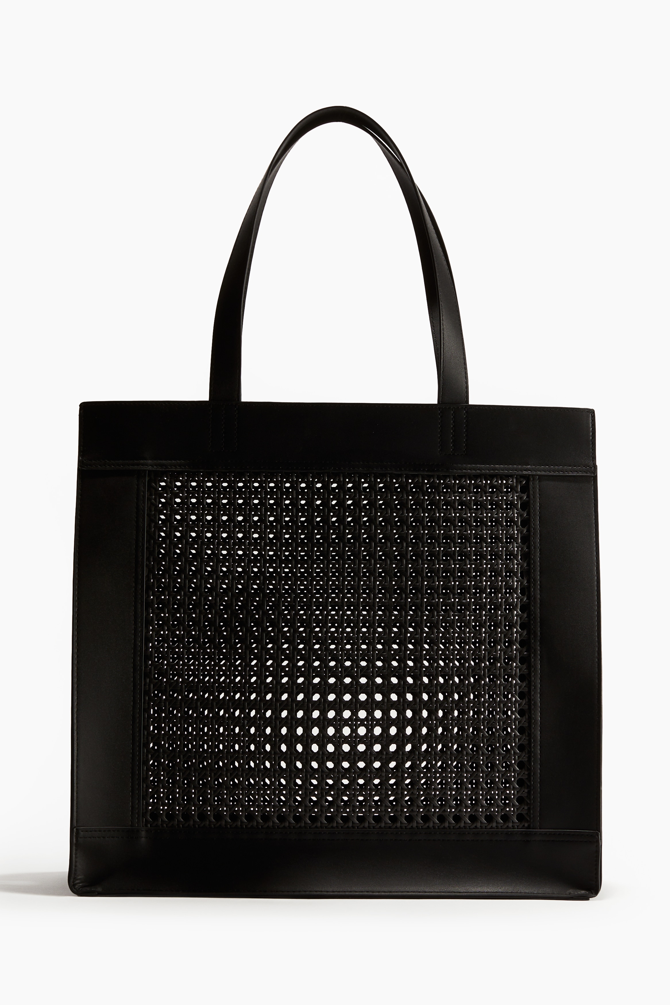 Shopper in coated fabric with two handles and rattan panel on the front and back. Features press-studs on each side to adjust the shape of the bag.