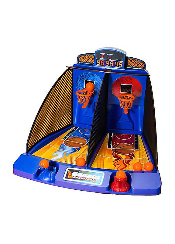 Shoot some hoops and become the next Michael Jordan with this genius electronic arcade basketball game designed to look like a full-sized basketball game in an arcade, this desktop-sized equivalent provides all of the fun of the fair from your own home use the flippers to propel the ball towards the basket and see who comes out on top after the timer elapses the game includes two ball launchers for competitive play, as well as a scoreboard complete with sound so you can be immersed in that head-to-head shoot out! Requires 3 x AA batteries (not included).
