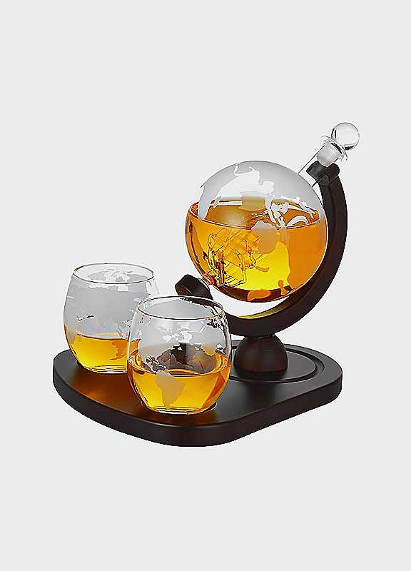 Made to resemble a classic globe, this blown glass decanter features a detailed glass ship inside it, resting elegantly on a wooden cradle. The set comes complete with two matching tumblers, making it the perfect gift for anyone who feels the (ahem) spirit of adventure!Whether for whiskey enthusiasts or collectors of unique decor, this stunning decanter set will surely bring a touch of nautical charm and sophistication to any home. It's a gift that combines style, craftsmanship, and a love for adventure.Age suitability: 18+ years