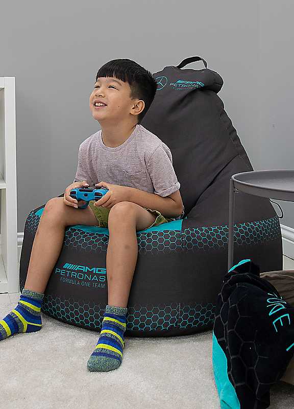 Perfect as a gift for any gamers or F1 fans in your life, this bean chair is officially licensed by the Mercedes AMG Petronas Formula 1 team. Offering more support than a standard bean bag, and more comfort that a standard computer chair, this Mercedes Formula One bean chair combines the comfort of a bean bag with the back support of a traditional gamer chair. The bean chair is set in black and features the Mercedes logo with AMG Petronas Formula One Team at the top of the backrest, with a teal seat and hexagonal band around the seat in green. On the back of the chair is the Mercedes F1 logo with the diffused hexagonal pattern in teal. The bean chair offers enough comfort and support for even long gaming sessions, when streaming, watching the race, or even binging films. It has a strap for storing headphones and headsets, plus a carry handle so it can be moved around, from bedrooms to playrooms to living rooms. The bean chair is made from stain, crease and water resistant material, and is easy to wipe clean, it's suitable for use outdoors in dry weather, it's fire retardant and meets British safety standards, and is filled with beans here in the UK. The bean chair is large enough to be comfy and supportive measuring 90 x 95 x 85cm (HxWxD) Wipe clean only 100% Polyester