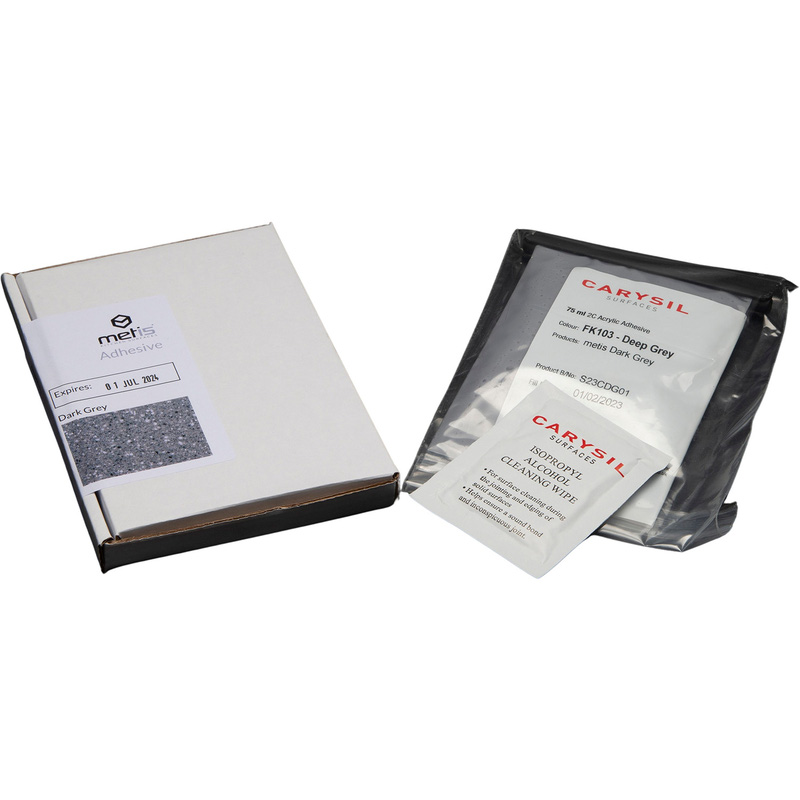 * 75ml sachet of colour-matched adhesive * Two part adhesive sachet * High Odour & Solvent Free * For Indoor Use A 75ml sachet of kitchen worktop adhesive and an isopropyl alcohol wipe to help with preparation - use the wipe for surface cleaning during the jointing and edging of solid surfaces, to ensure a sound bond and an inconspicuous joint.* Two-part 75ml sachet of worktop adhesive* For use with Metis Dark Grey worktop surfaces* Isopropyl alcohol wipe for preparation* Easy to work with - suitable for indoor use* Each adhesive sachet is enough for one joint | Metis Dark Adhesive Sachet 75ml in Grey