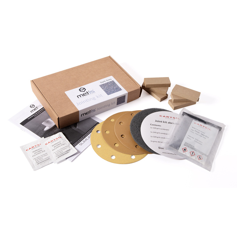 * All materials required for the completion of one metis joint * High Odour & Solvent Free * For Indoor Use * Contains two part adhesive sachet 1x 75ml Adhesive Sachet, 2x Isopropyl Alcohol Wipes, 6x MDF Blocks and Sandpaper (120G, 240g and 320G) Everything you need for the completion of one Metis worktop joint. The kit includes a 75ml sachet of adhesive with two isopropyl alcohol wipes, six MDF blocks, three grades of sandpaper and a grey abrasive pad.* Jointing kit for use with Metis Light Grey worktops* All you need for the completion of one joint* Supplied with care and installation leaflet* Includes 75ml sachet of two-part adhesive* Alcohol wipes, MDF blocks, sandpaper and abrasive pad also included | Metis Light Worktop Joint Kit in Grey