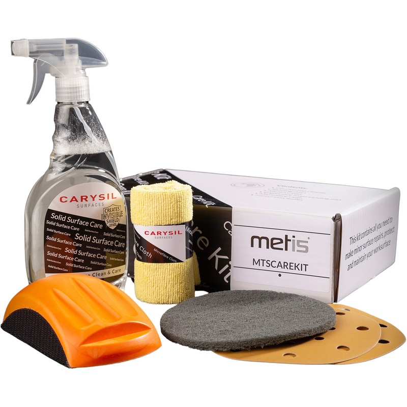* A set of items to help you maintain your metis worktop * All that you need to make minor repairs to your worksurface * Special surface cleaner to help maintain, protect and build up a lustre * 1x 500ml Solid Surface Clean & Care, 1 x Ergonomic Foam Sanding Block, 2 x Sanding Discs, 1 x Microfibre Cleaning Cloth, 1 x abrasive pad, Instructions Everything you need to maintain your Metis worktop, in one box. This care kit includes a special surface cleaner to keep it looking its best, as well as a pack of essentials for making minor repairs.* Kit to help you care for a Metis kitchen worktop* Special surface cleaner maintains and protects* Comes with essentials for minor running repairs* Includes 1x 500ml Solid Surface Clean & Care, 1x foam sanding block, 2x sanding discs, 1x microfibre cleaning cloth, 1x abrasive pad and instructions | Metis Worktop Care Kit