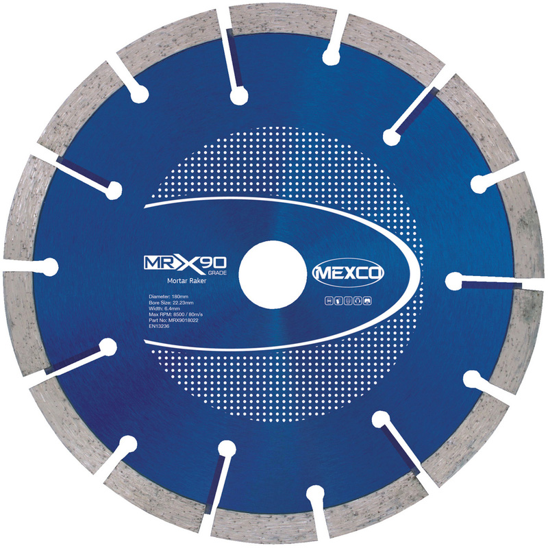 Offers fast removal of mortar joints between bricks, natural stone and facing bricks. Can also be used to cut lead flashing. | Mexco Premium Mortar & Brick Raking Diamond Blade 180mm x 6mm