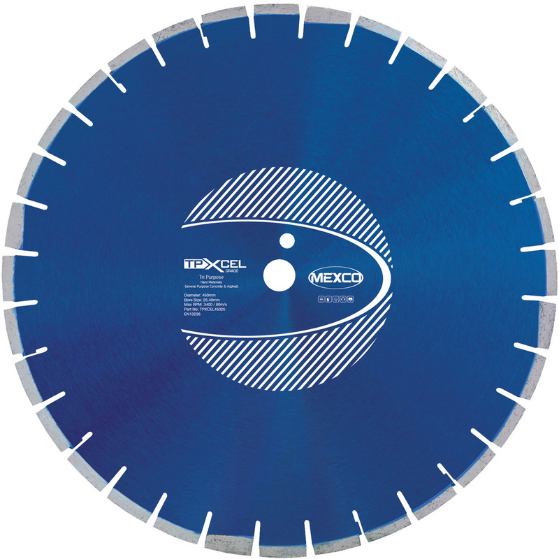 Designed specifically to remove the hassle of having to change blades for different materials. Castellated segment design ensures quick stock clearance and a clean finish, plus ventilation cooling holes within the steel centre allow for rapid heat dispersion. Suitable for: * Medium Facing Brick * Hard Slate * Concrete * Reinforced Lintels * Hard Limestone * Limestone Aggregate Concrete * Concrete Blocks Over 15KN * Hard Sandstone * Breeze Block * Shallow Concrete Screed * Asphalt Over Concrete * Ductile Iron* * Granite* * Clay* * Hard facing brick* * Green concrete* * Lignacite blocks* * Asphalt* * Will cut but may result in reduced lifetime or glazing* | Mexco Premium Multi-Purpose Diamond Blade 450mm