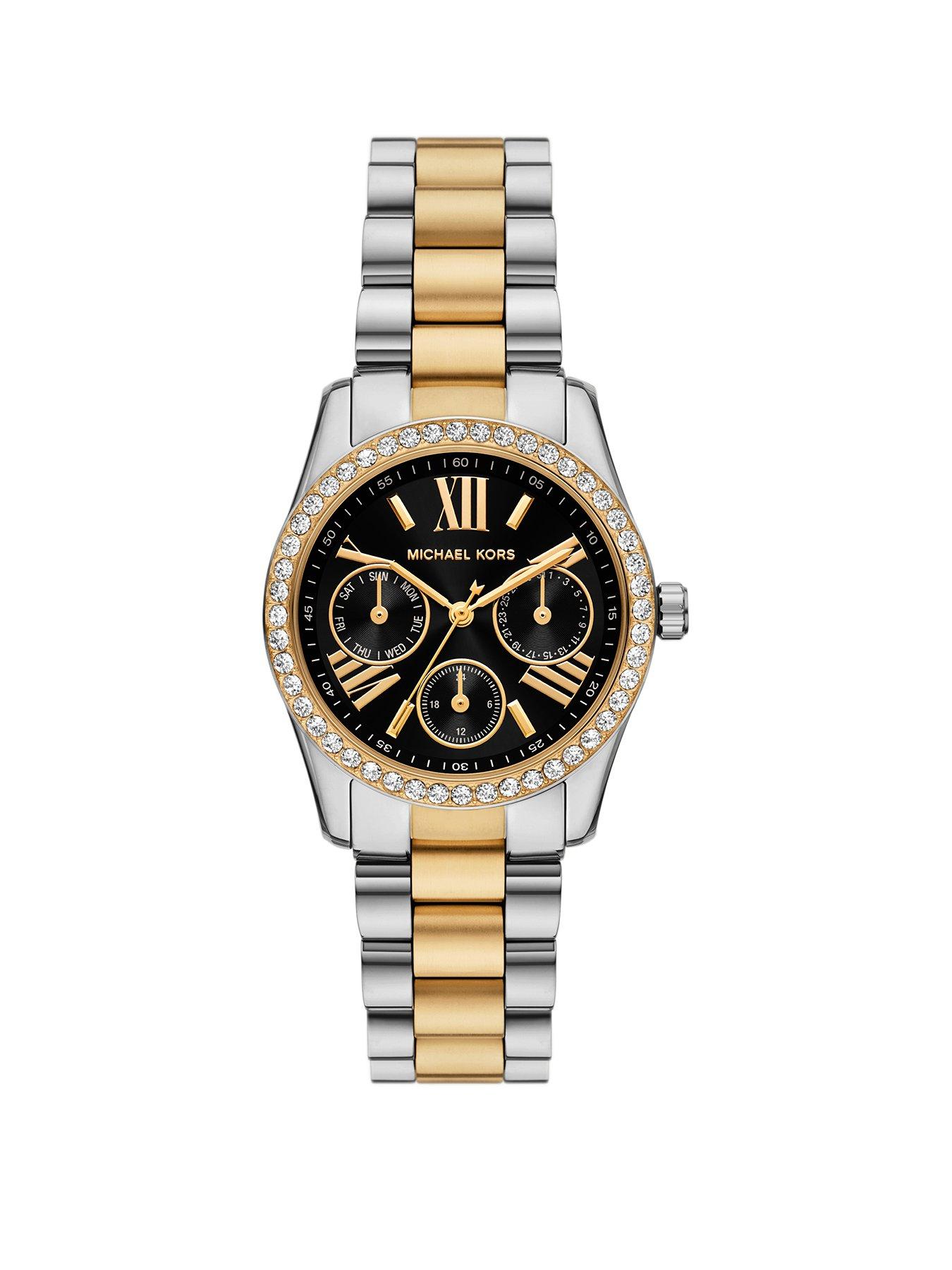 Michael Kors Women'S Lexington Lux Multifunction Two-Tone Stainless Steel Watch, Mk4925 A Timeless Icon With A Modern Update, The Lexington Lux Watch Features A Scaled-Down 33 Mm Case For A Refined Fit, While Its Signature Three-Link Bracelet And Glitz Topring Add A Touch Of Glamour. A Striking Black Dial Is Set Against A Stainless Steel And Height: 9 Mm Width: 33 Mm Case Diameter (In Cm): 3.3 Case Height (In Cm): .9 Case Shape: Round Case Width (In Cm): 3.3 Glass: Mineral Movement: Japanese Quartz (Battery) Strap Material: Stainless Steel Water Resistant: Y Dial: Round Case, With A Sunray Black Dial. Watch Band: Two-Tone Silver And Gold Durable Stainless Steel Bracelet; Links Can Be Removed For A Customized Fit. Water Resistant: Up To 50M (165Ft): Wearable For Short Periods Of Recreational Swimming And Showering, But Not Diving Or Snorkeling; 5 Atm.