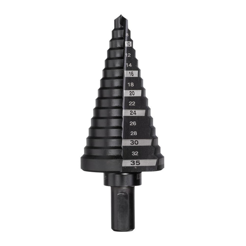 Step Drill advantages over conventional drill bits: - One drill bit to drill multiple sizes. Best option for enlarging existing holes. Drill up to 14 different sizes with one Milwaukee step drill bit. Increasing in 2-3mm intervals from 6-35mm, it’s a great option for enlarging existing holes and a far more durable alternative to twist drill bits – the thicker core offers a much higher resistance to breakages. Milwaukee step drills can be drilled into a variety of materials including ferrous and non-ferrous sheet metals, profiles and pipes, as well as copper, brass, aluminium, stainless steel and plastic. Suitable for material thicknesses of up to 4mm, with the use of coolant recommended for longer bit life. * 2-3mm step intervals – choice of 14 steps from 6-35mm * Laser-engraved size markings – easy to identify * 10mm shank diameter – overall length of 90mm * More durable than twist drills – thick core resists breakage * Suitable for metals and plastics – 4mm maximum thickness * Optimised for cordless – ideal for high-speed cordless drills * Rapid Strike tip – precise centering and jam-free performance * Longer life – custom steel and black oxide coating | Milwaukee Step Drill Bit 6-35mm in Black | Plastic
