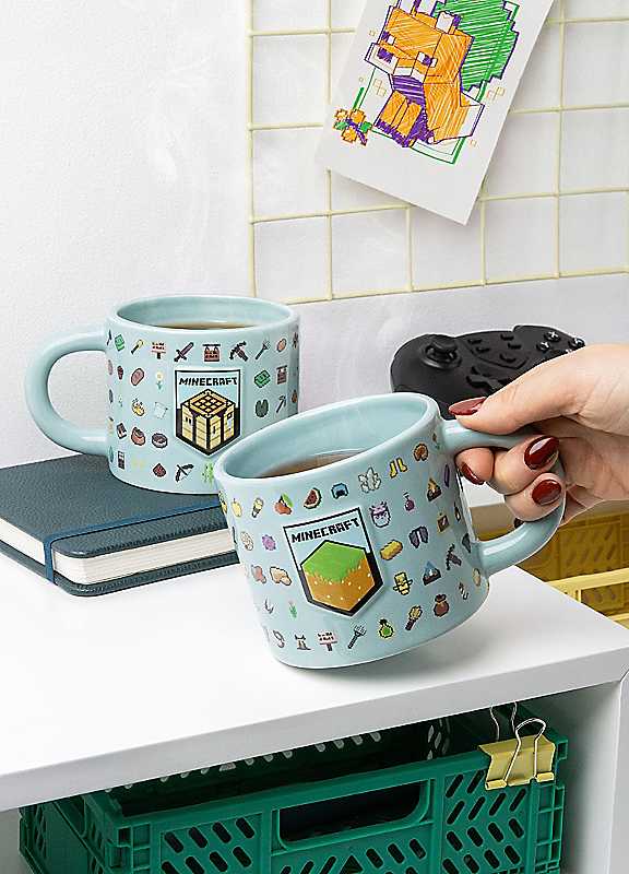 Level up your coffee breaks with this inventory-inspired Minecraft Mug, featuring embossed details of the Crafter Block and Earth Block. Perfect for hot drinks, it's the ultimate gamer's companion. The large 400ml (13 fl oz) blue ceramic mug features embossed details of the Crafter Block and Earth Block on either side. The rest of the mug is covered in inventory items, tools and weapons, making every sip an adventure. Perfect for hot drinks, it's the ideal companion for work, home or gaming sessions.Not suitable for dishwasher or microwave use.The Minecraft Mug is a must-have for any gamer's kitchen cupboard. | ceramic coffee mugs