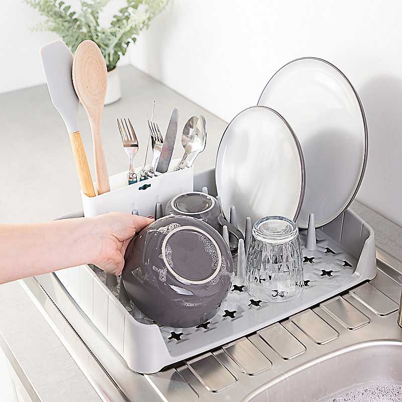 Minky New Grey and white Dish Rack & Caddy is the perfect addition for any stylish kitchen! This flexible sink side storage solution has a multi-position utensil caddy making washing and drying so much simpler.Fits variety of crockery & utensilsMulti position utensil caddySturdy design with smooth draining prongsSloped surface & drainage holesEasy clean smooth surfacesPlasticDimension approx. 8 x 41.2 x 33.7 cm
