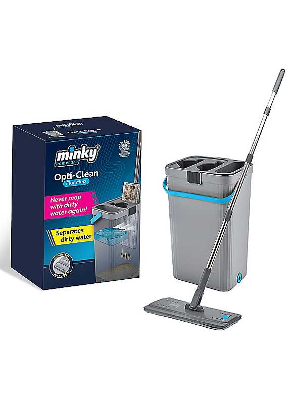 The powerful microfibre head cleans floors thoroughly and can simply be removed and machine washed ready for next use. Designed with scrubbing spikes to remove dirt from the mop pad and wringing blades to dry, it delivers a thorough floor cleaning experience. For ease of use, the bucket has a sturdy handle and can be placed under a tap to fill directly into the clean water cavity. Any dirty water can be drained away by removing blue plug at the base of the dirty water section. When not in use, the Minky Opti-Clean Flat Mop can be stored with ease due to its compact, slimline design.Separates dirty and clean water, 100% clean water with every rinsePowerful microfibre head for sparkling clean floorsScrubbing spikes remove dirt/hairs when rinsingWringing blades to dry mop padReusable and easy change mop padPlastic/SteelDimensions approx. 153H x 26W x 20D cm