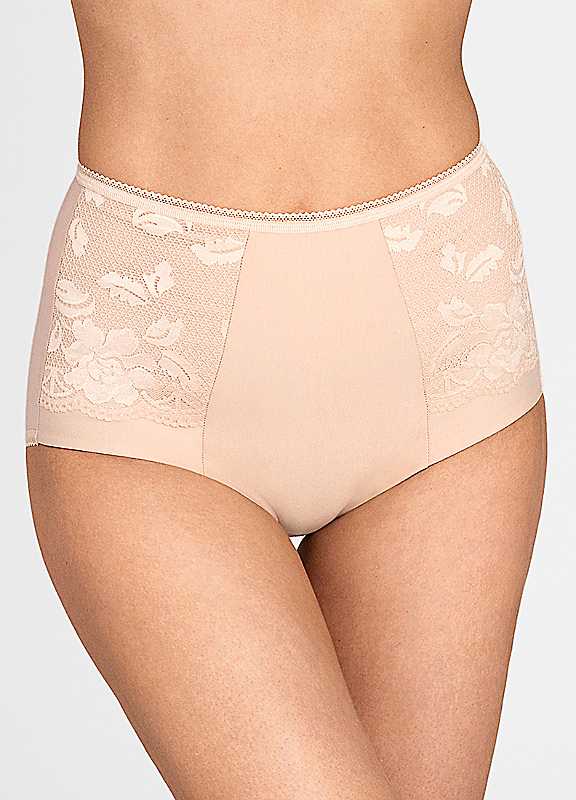 An elasticated Cotton Pantie girdle. With a reversibly sewn front and a soft band at the waist and at the leg openings, the girdle is finished with decorative lace at the sides and a comfortale cotton lined gusset. Brand: Miss Mary of Sweden Washable 54% Cotton, 29% Elastane, 17% Polyamide | under dress shapewear, waist shapewear, shapewear panty, high waisted shapewear, cotton shapewear, comfortable women's underwear, women's lace panties, slimming underwear, beige shapewear, women's cotton panties, girdle shapewear, shaping undergarments, women's cotton underwear, tummy flattening shapewear, shapewear underwear