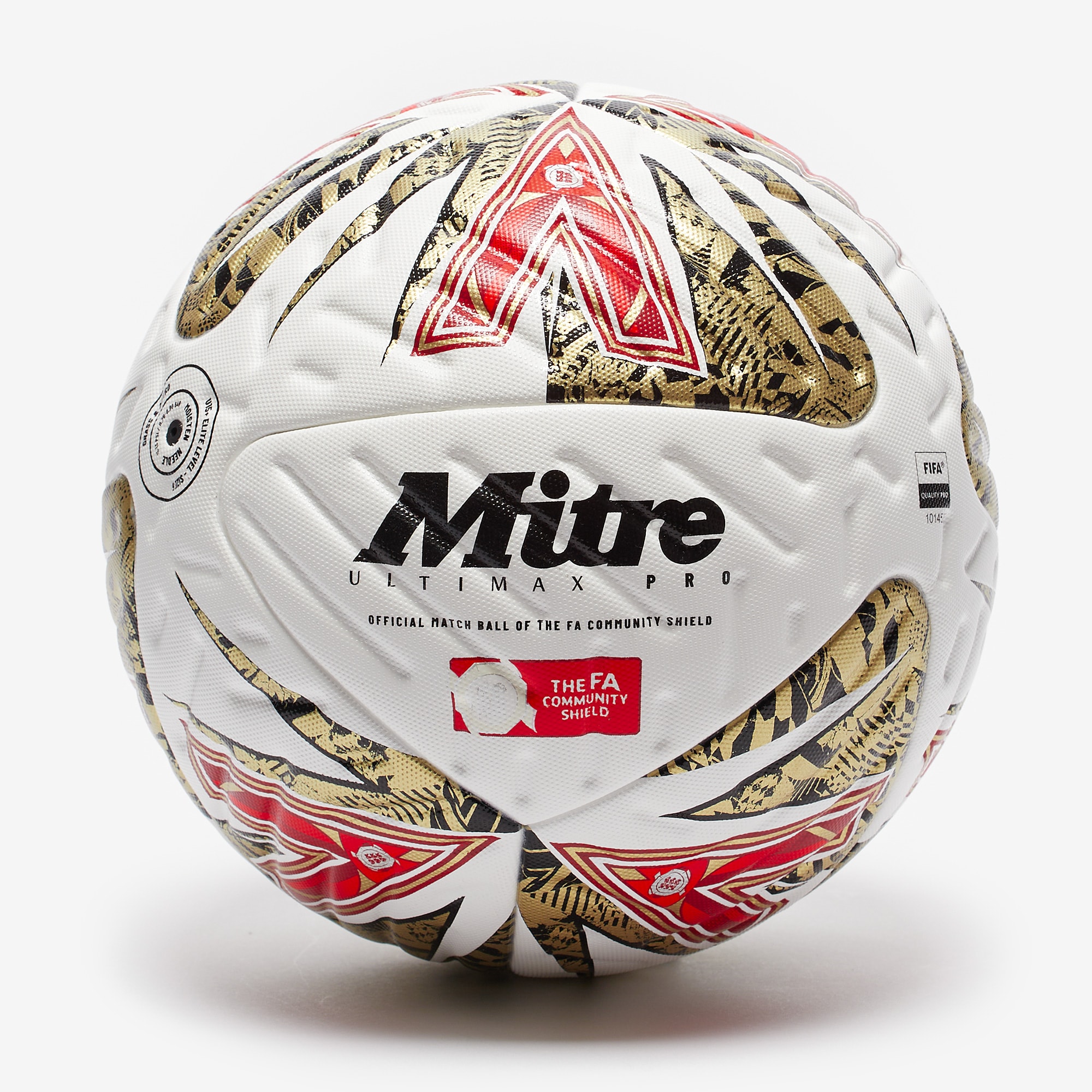 Get ready for the 103rd Community Shield as Liverpool and Crystal Palace compete for the first silverware of the season with the Mitre Ultimax Pro 2526 Community Shield Football in WhiteGoldRed. FIFA Quality Pro certified, this prolevel football guarantees perfect circumference, weight, rebound and water resistance. Used for the seasons curtainraiser at the 2025 FA Community Shield match between FA Cup winners Crystal Palace and Premier League champions Liverpool this ball allows you to practice and play like the very best. Bold white, gold and red contrast colours combine with Mitres legendary chevron graphics to ensure that you can easily keep track of play on any surface, come rain, snow or shine. The FIFA Quality Pro certification verifies that the ball has passed rigorous tests on circumference, weight, rebound and water resistance, ensuring a professionalquality feel. A unique fourpanel shell provides a soft, consistent touch, so you can take your technique to a new level. Hyperfoam technology uses high elastic cushioning to help you put more power into your strikes and launch the ball from range, while the debossed Hyperflow surface manipulates airflow to enhance stability as the ball travels through the air and give your shots and passes more accuracy. Thermal bonding offers superb durability and reduces water uptake, so the ball maintains its shape for longer, no matter how intense your training sessions or games are. Mitre 202526 Ultimax Pro FA Community Shield ball Official FA Community Shield branding FIFA Quality Pro certification Hyperfoam technology Hyperflow technology Hyperseal technology Fourpanel, thermally bonded construction Size 5 Requires inflation