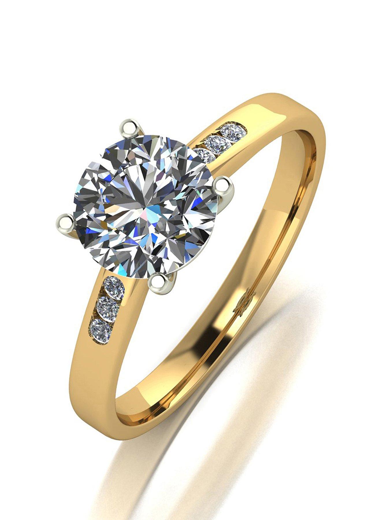 Bring warm colour and sparkle to any special moment with thisMoissanite 9ctGold 1.35ctSolitaire Ring. This eye-catching 9ct Yellow Gold Moissanite Solitaire ring with moissanite set shoulders is setwith a 7.0mm Round Brilliant Cut Moissanite and a further 4each sidemaking an impressivetotal of 1.35ct. This stunning piece is the showstopping way tocelebrate a birthday, engagement, anniversary or just to show your loved one that your love is like this ring - forever shining bright. It comes presented in abranded deluxe double box to increase the 'wow' factor, with acertificate of authenticity for your records. Height: 21 MM Width: 21 MM Fashion Jewellery Type: Rings Metal Type: Yellow gold Ring Type: Engagement Stone: Moissanite Stone Colour: White Stone Type: Gem 9ct Yellow Gold 1.35ct Total Eq Feature stone is a 7mm Round Brilliant Moissanite Available in sizes H-V Hand Crafted in the UK Included Double Deluxe Gift Box and Certificate