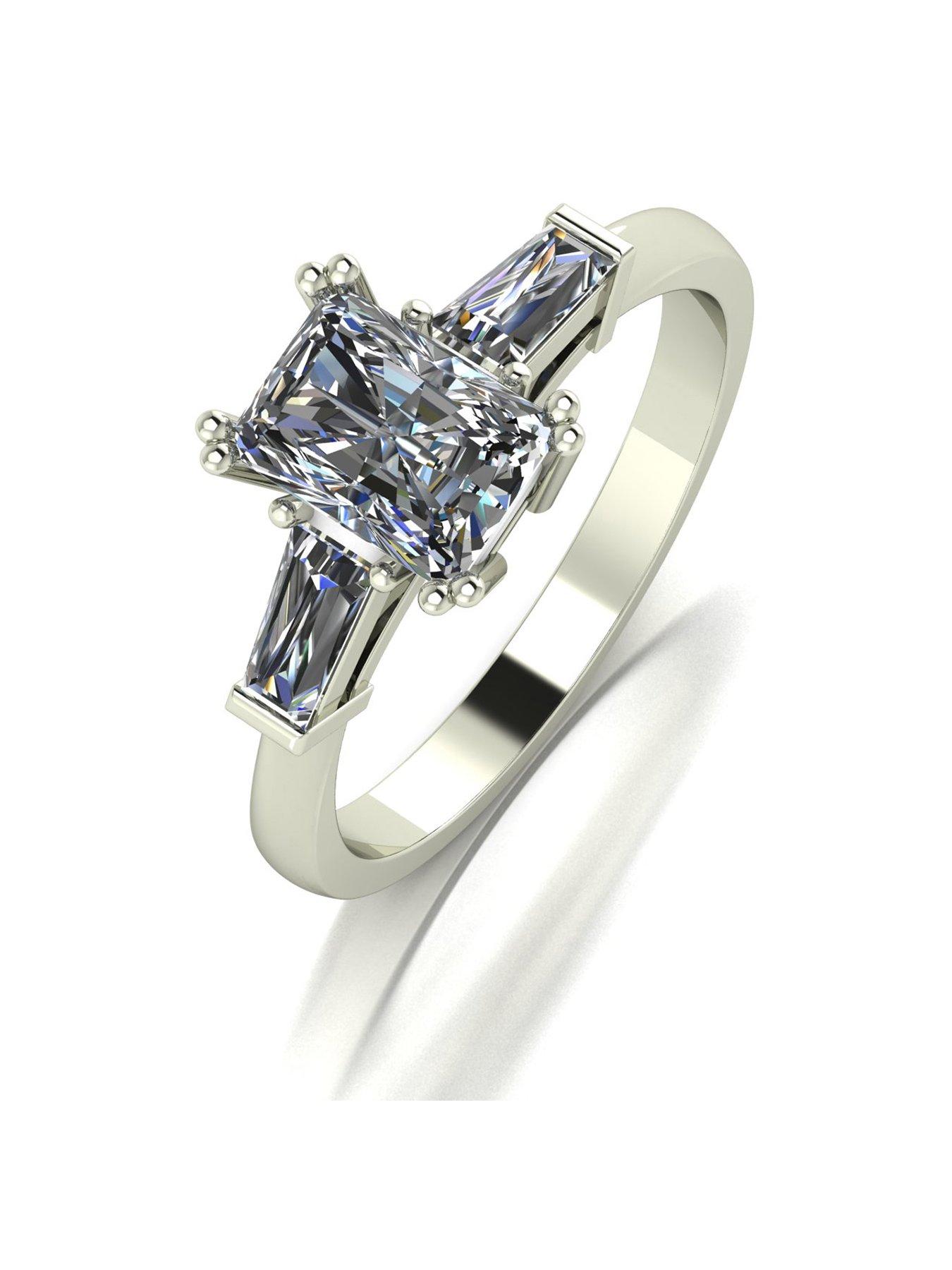 Moissanite 9ct White Gold 1.70ct Eq Radiant Cut Solitaire Ring With Tapered Baguette Shoulders 9ct White Gold 4 Claw Radiant Cut Solitaire Ring with Baguette Moissanite Set Shoulders. Featuring a centre a 7x5 Radiant Cut Moissanite and a further Tapered Baguette Moissanite on each shoulder totalling a eq of 1.70ct Height: 21 MM Width: 21 MM Fashion Jewellery Type: Rings Metal Type: White gold Ring Type: Engagement Stone: Moissanite Stone Colour: White Stone Type: Gem 9ct White Gold 1.70ct eq total Diamond Stone Weight 7x5mm Radiant and 2 x 5x2.5 Baguette Available in sizes H-V Hand Crafted in the UK Included Double Deluxe Gift Box and Certificate