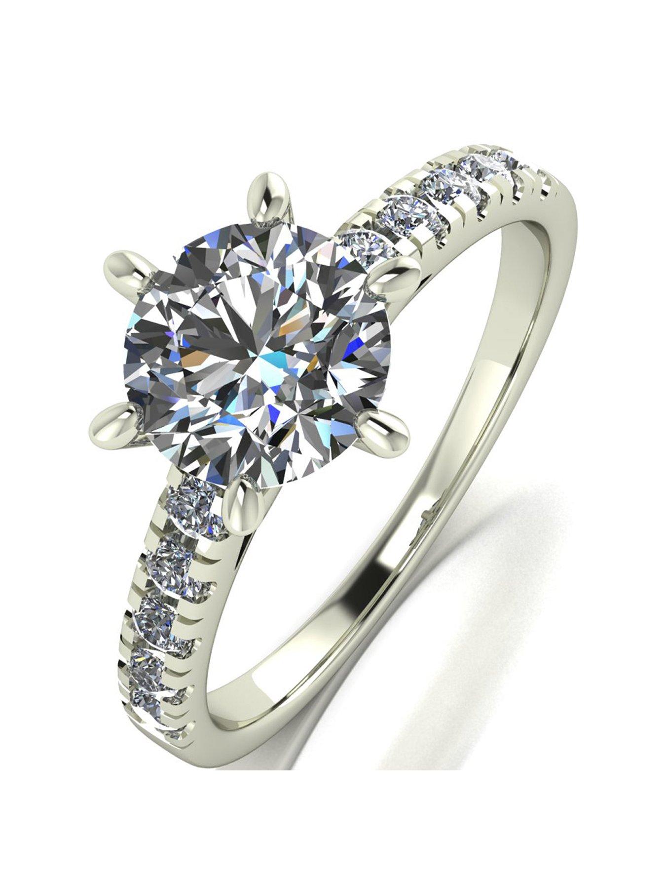 This Lady Lynsey Moissanite Solitaire Ring Sparkles Like No Ring You Have Ever Seen Before. From Lady Lynsey Jewellery Designs, Comes This Stunning 9Ct White Gold Moissanite Solitaire Ring. Handset With A 7.5Mm Round Brilliant Moissanite And Further Enhanced By The Shoulder Moissanite, It Boasts 2Ct Of Total Brilliance. This Stunning Piece Would Make A Showstopping Engagement Ring, But Its Versatile Design Would Also Make It Perfect For A Birthday, Anniversary, Christmas Or Valentine'S Day Gift. It Comes Presented In A Branded Deluxe Double Box, Ready To Leave Your Loved One Lost For Words. It Also Includes A Gift Bag And A Certificate Of Authenticity For Your Records. Height: 25 Mm Width: 21 Mm Carat: 2 Fashion Jewellery Type: Rings Metal Type: White Gold Ring Type: Engagement Stone: Moissanite Stone Colour: White Stone Type: Gem 9Ct White Gold 2Ct Total Eq Feature Stone Is A 7.5Mm Round Brilliant Moissanite Available In Sizes H-V Hand Crafted In The Uk Included Double Deluxe Gift Box And Certificate From Lady Lynsey Jewellery Designs