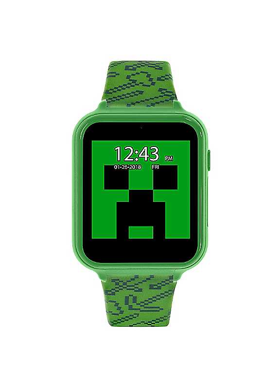 Mojang Minecraft interactive watch with printed soft silicone strap. The touch screen watch features 10 changeable watch faces, selfie photo/video camera, games, fitness tracker, alarm/stopwatch/timer, voice recorder and calculator. USB cable supplied for charging and data download. Packaged in an official branded gift box and comes with one year guarantee. Brand: Minecraft 10 x faces to choose between Touch screen, selfie photo/video camera, games, fitness tracker Alarm/stopwatch/timer, voice recorder & calculator USB cable 12 month manufacturer guarantee