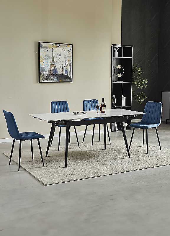 A classic extending ceramic dining set. The sturdy 10mm thick tabletop is set off by fashionable white reflective marble effect finish and is complemented by 4 sloped contemporary dining chairs, upholstered in sleek brushed velvet fabric. Enhance your dining space with this stylish and functional dining set which combine aesthetics with practicality.Dimensions Table: H88 x W180 x D80cmDimensions Chair: H88 x W43 x D57cmSpecifications Material: Ceramic, MetalSuggested Number of People for Assembly: 1/2Tool Kit Included: Yes Self-AssemblyManufacturer's 1 year guaranteeProduct Care: Wipe clean only, avoid household cleaners/abrasivesPlease remember to measure your available space before ordering. If using on an un-carpeted floor we recommend rubber or felt protection pads be used under the legs to avoid damage to your floors.