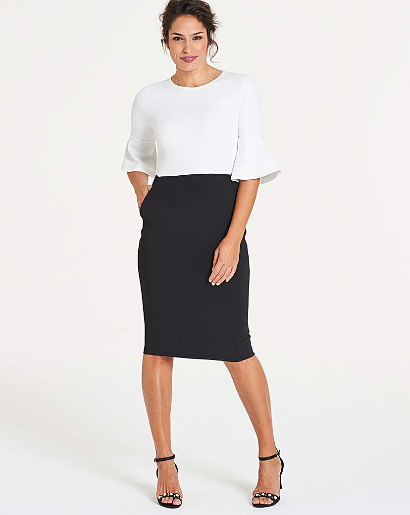 This striking mono dress comes in a bodycon shape and is made from flattering stretch scuba fabric. With front pockets, stylish exposed back zip and features pretty fluted sleeves.
