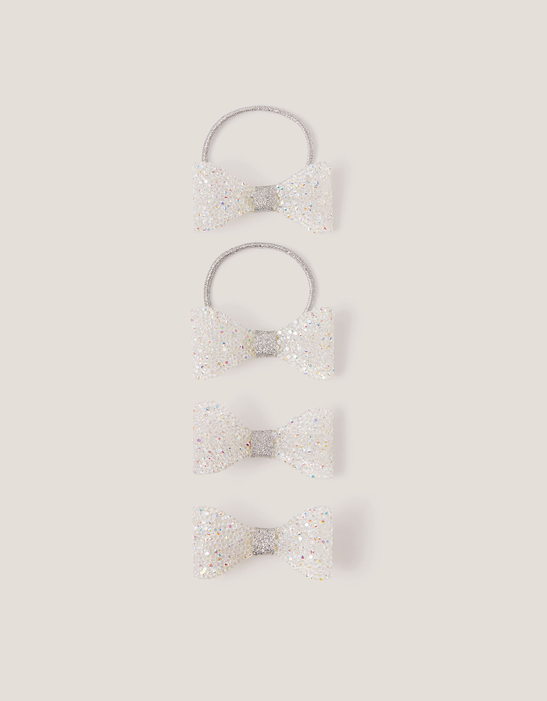 Just add sparkles! A bow-tiful addition to their plaits, pigtails and updos, these hair accessories are decorated with dazzling bows in an iridescent finish. Two hair bands and two hair clips included.Warning! Choking Hazard—Small parts. Not suitable for children under 3 years old.