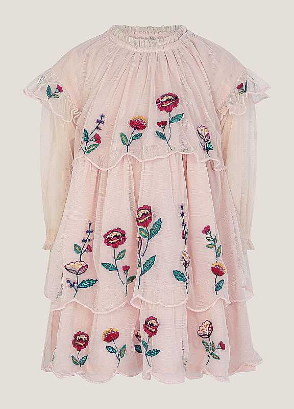 For the mini you. Featuring embroidered vibrant blooms, this long sleeve dress feels like a breath of fresh air in their wardrobe. Designed with dainty scallop-edged tiers, it's the perfect pick for days out.Machine washable100% Polyester (Recycled)