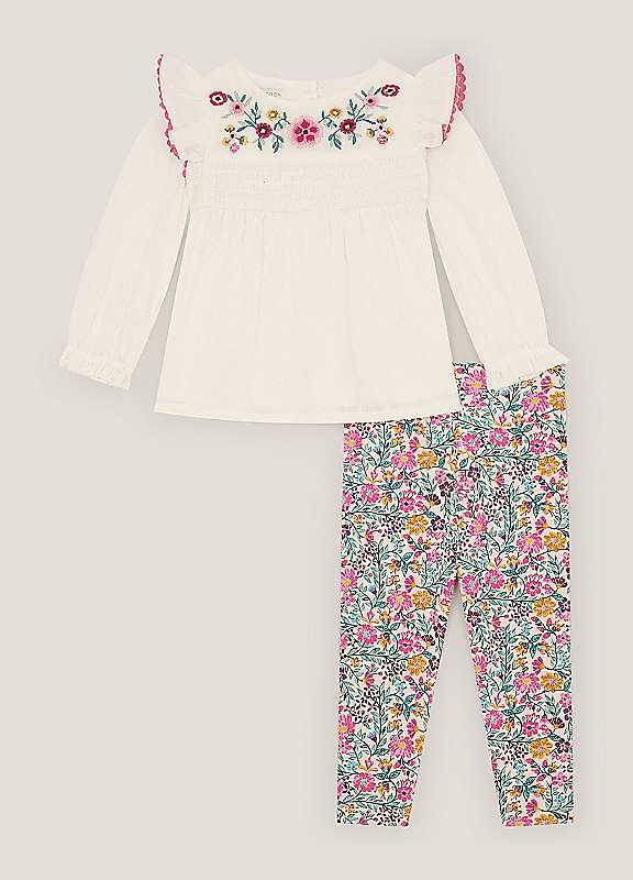 Baby in bloom. Decorated with embroidered flowers, the woven top features a smocked band and scallop frills that pair perfectly with the stretchy leggings. Whether you're taking them out in the stroller or visiting family, this set will become a go-to.Machine washable100% Cotton