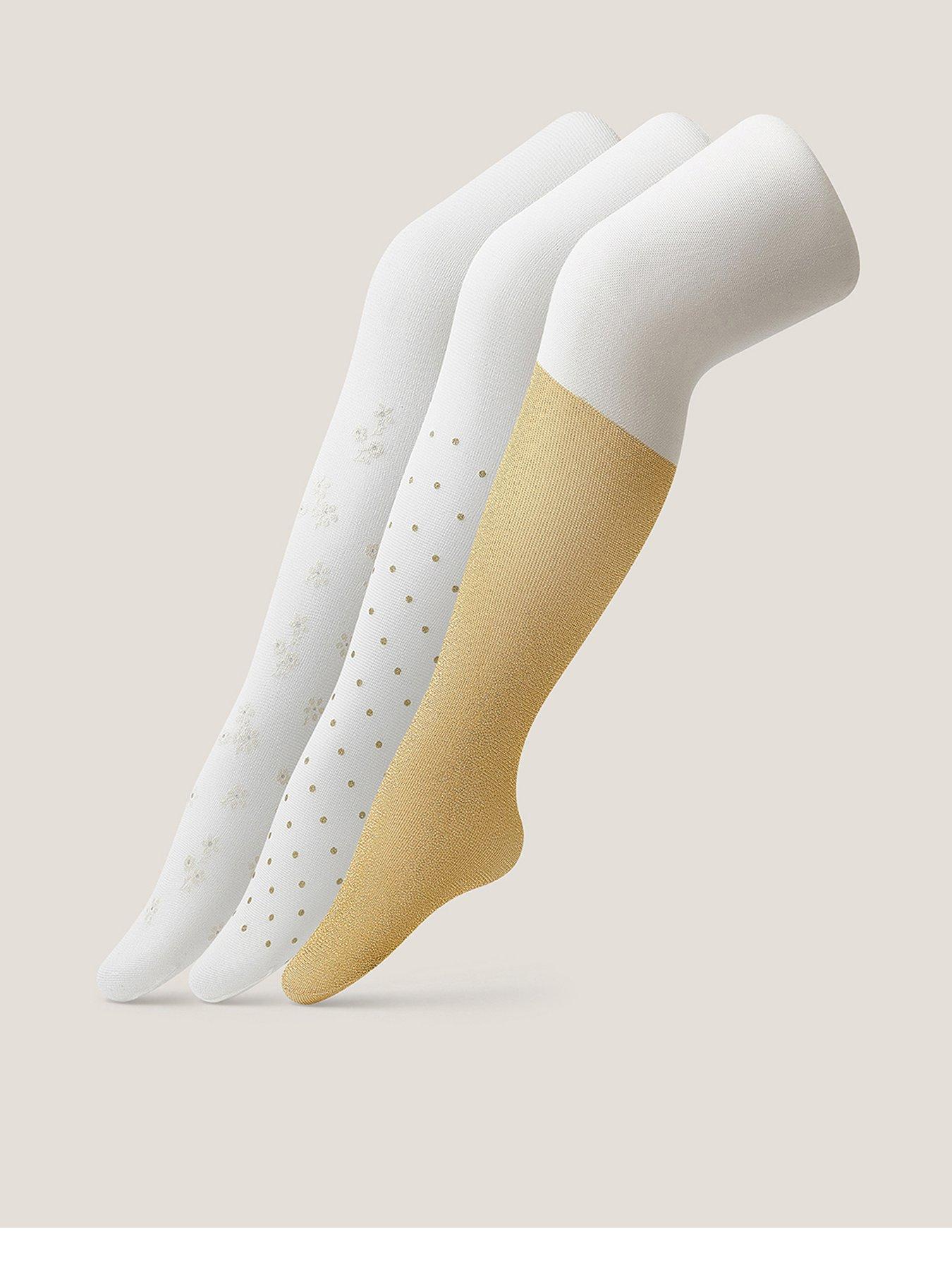 Monsoon Baby Girls 3 Pack Glitter Tights - Gold Time To Shine. Boasting Two Spotty Styles And One Golden Glittery Pair, These Tights Add Endless Sparkle To Baby'S Party Outfits. 3 Pairs Of Tights Included. Material Content: Composite: Elastane 8%, Metallised Fibre 18%, Polyamide 74% Washing Instructions: Machine Washable