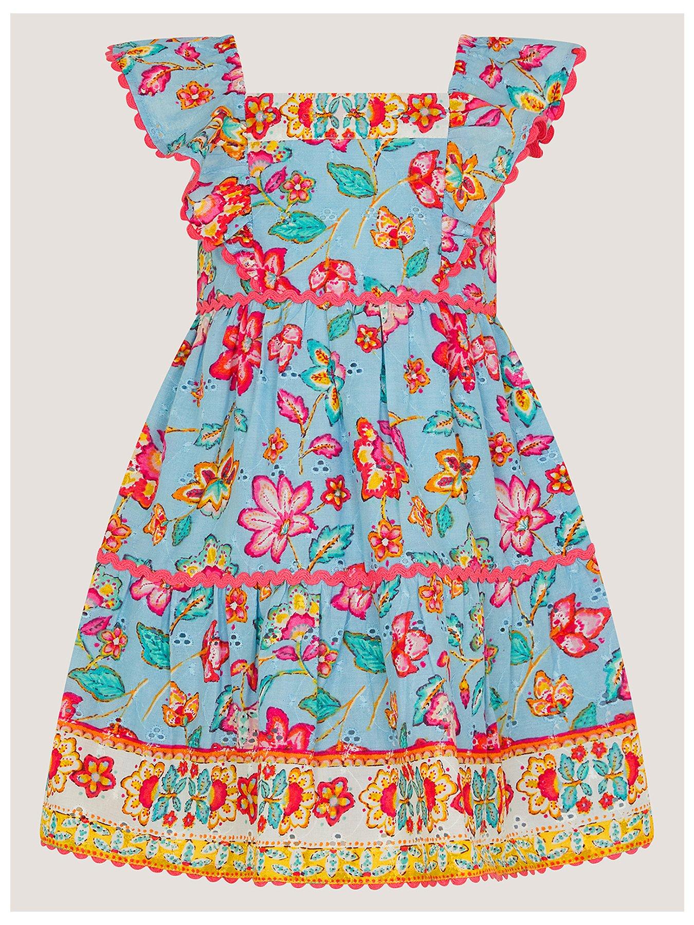 Monsoon Baby Girls Adara Heritage Dress - Blue Today'S Forecast: Bright! Made With Broderie Cotton In A Lovely Sky Blue, This Dress Is Patterned With Heritage Florals In A Mix Of Super Vibrant Colours. Trimmed With Ric Rac Embroidery And Frilly Straps For An Elevated Finish, It'S A Beautiful Pick For Them To Wear Day And Night. Material Content: Lining: Cotton 100%, Shell: Cotton 100% Washing Instructions: Machine Washable