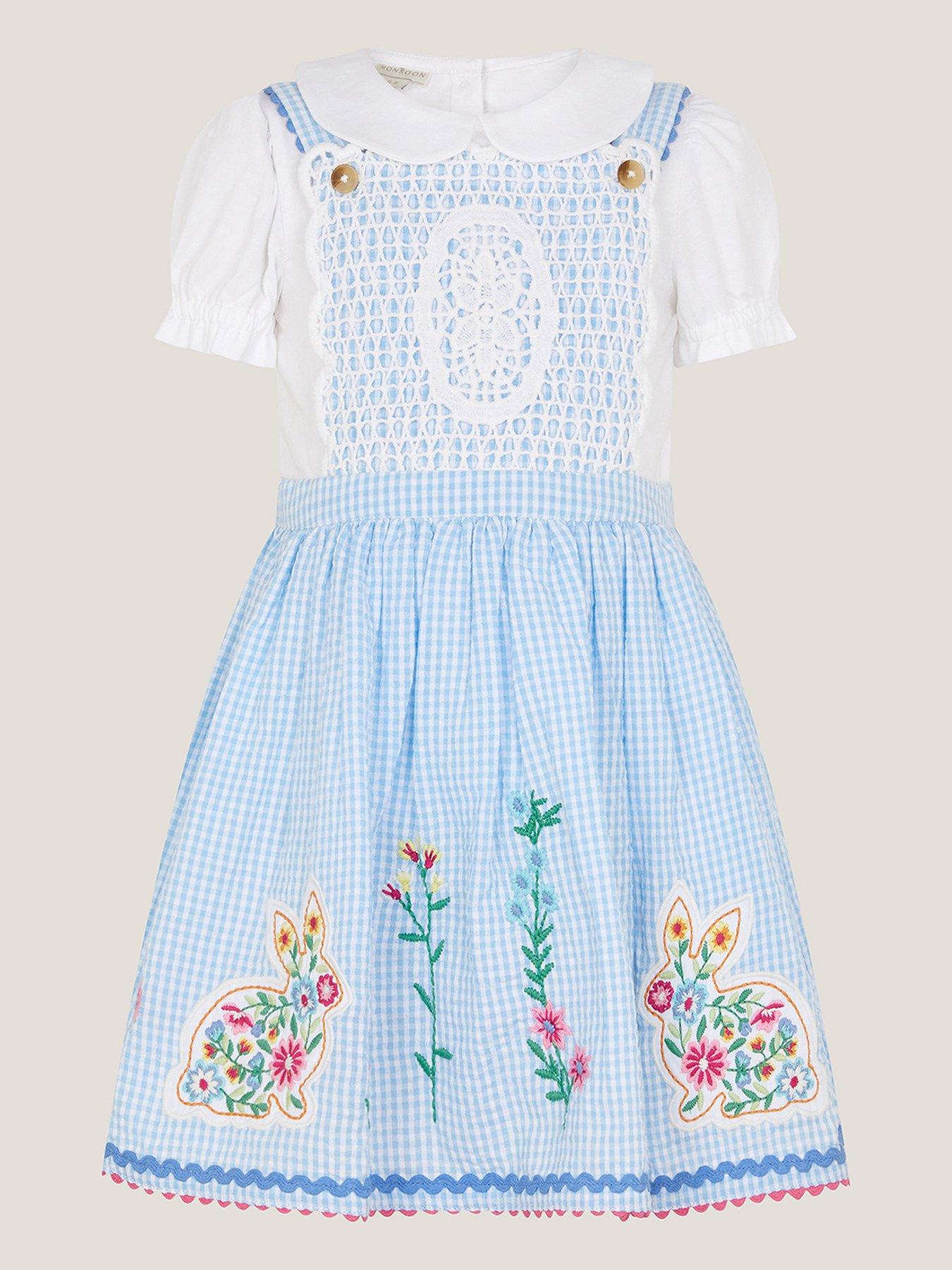 Monsoon Baby Girls Bunny Gingham Pinny & Tshirt - Blue The Piece Of Prairie Dreams. Designed With A Sky Blue Gingham Print With Embroidered Blooms And Bunnies, This Set Is Made For Crawling Through Grass And Going On Their First Picnic. Included Is A Pinafore With A Smocked Bodice And A Short Sleeve Blouse. Think Of All The Adorable Pictures... Material Content: Lining: Cotton 100%, Top: Cotton 100% Washing Instructions: Machine Washable