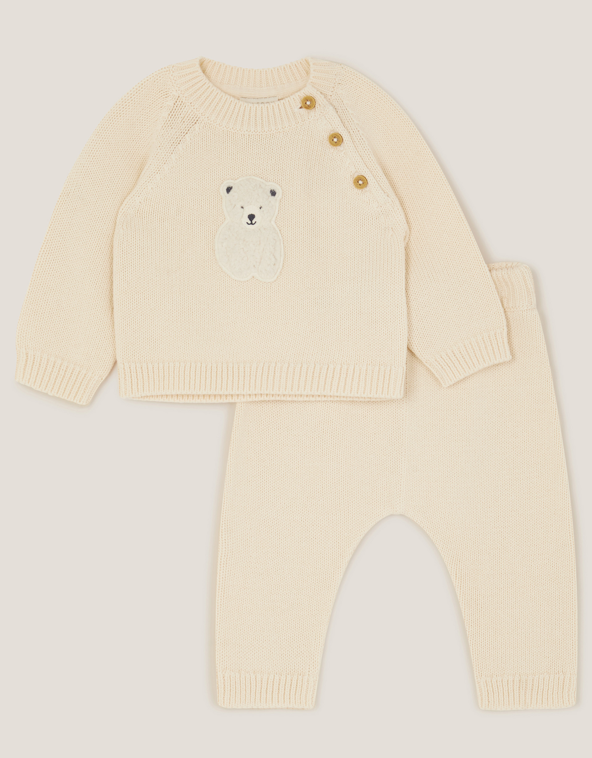 Snuggle season. Dress the new arrival in someone as cute as they are! Stitched in super-soft cotton, this knitted set includes a top and trousers, with a cuddly polar bear patch on the front. Ivory