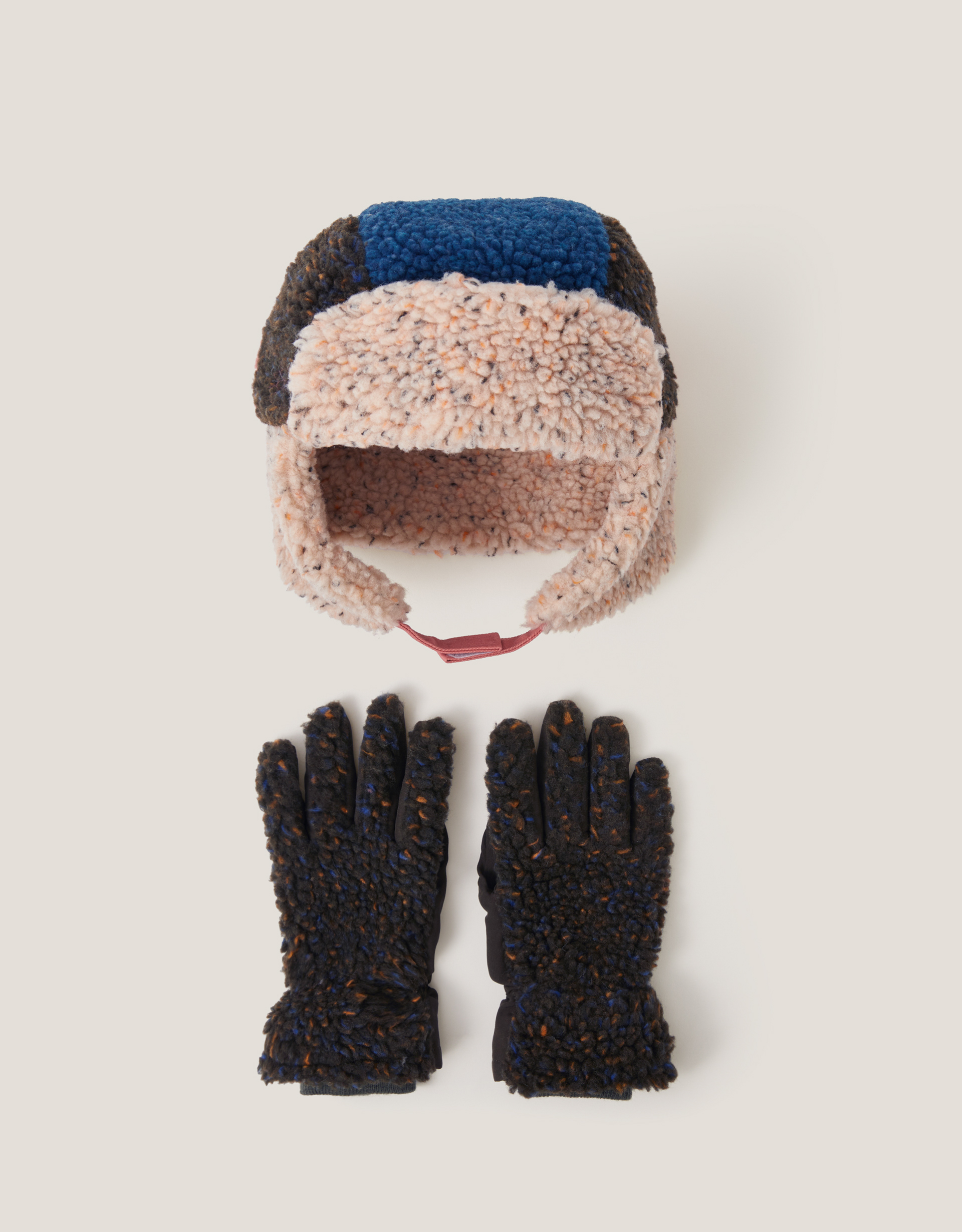 Cool dudes keep warm. When the air turns crisp, whip these out. Made from snuggly borg fabric, this set includes a trapper hat with a rip-tape chin fastening and brown gloves to match. Multi