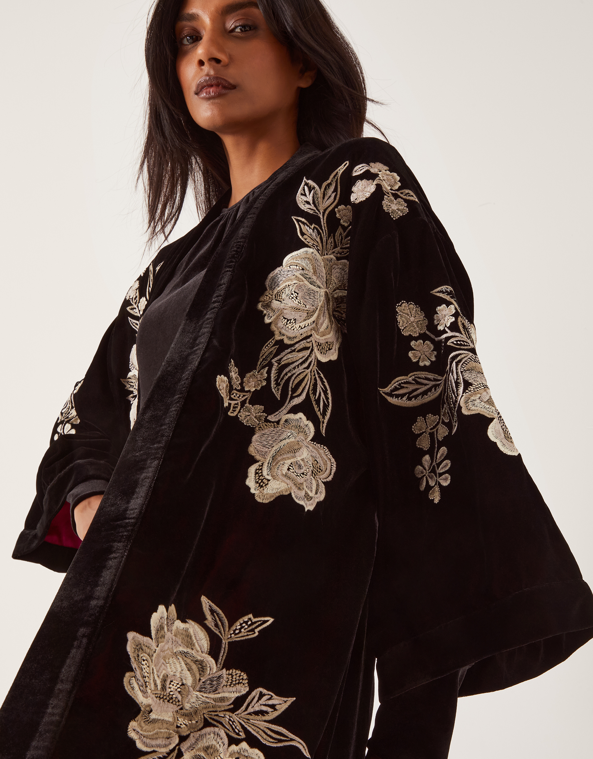 Monsoon Black Fia Floral Velvet Kimono Embroidered, in Size: L