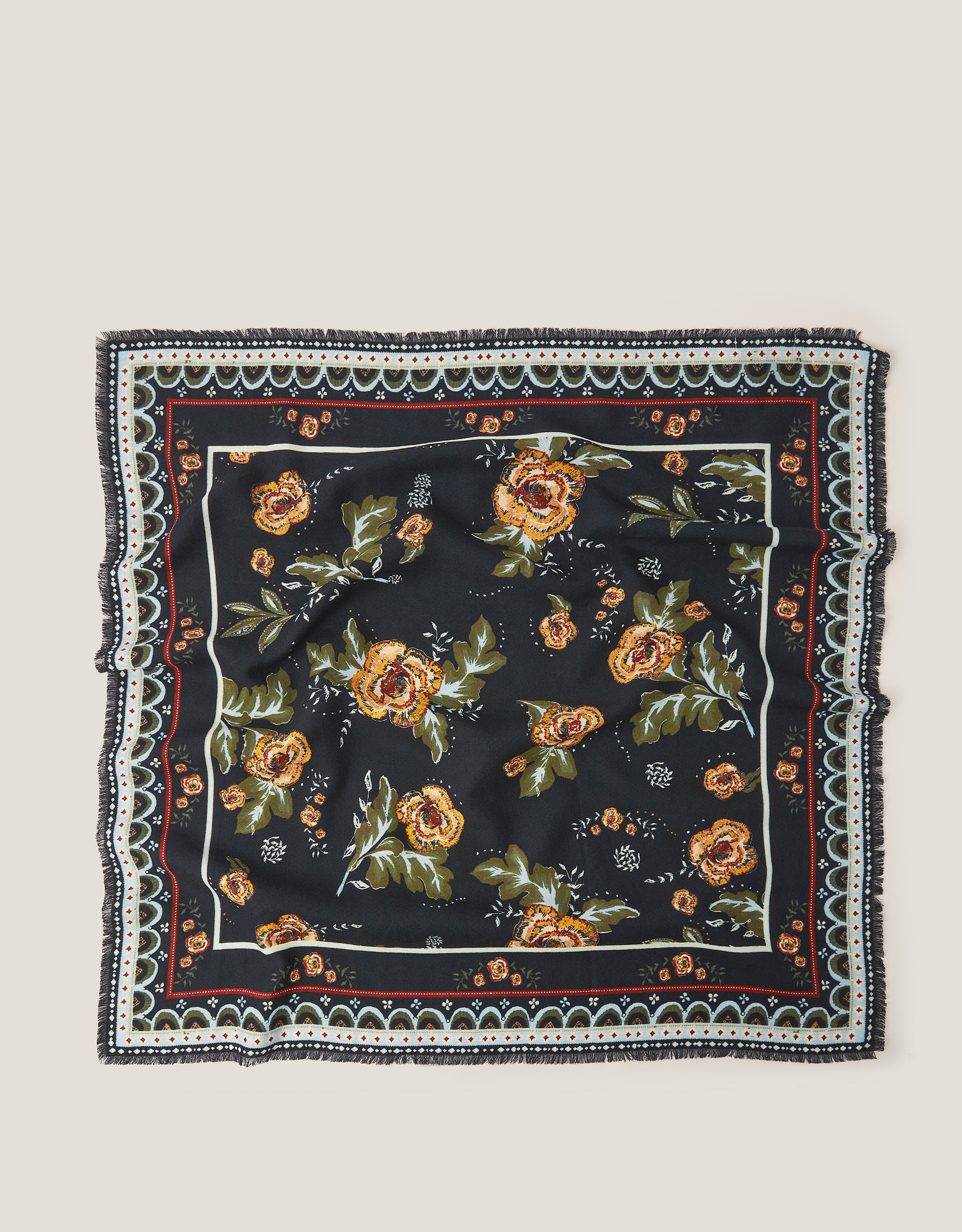 Wear the bouquet. Printed with beautiful blooms and a decorative border, this scarf has been spun from a cosy cotton blend and cut in a square shape, perfect for draping and tying. Finished with fringe detailing, it's sure to be a staple in your weekly rotation.