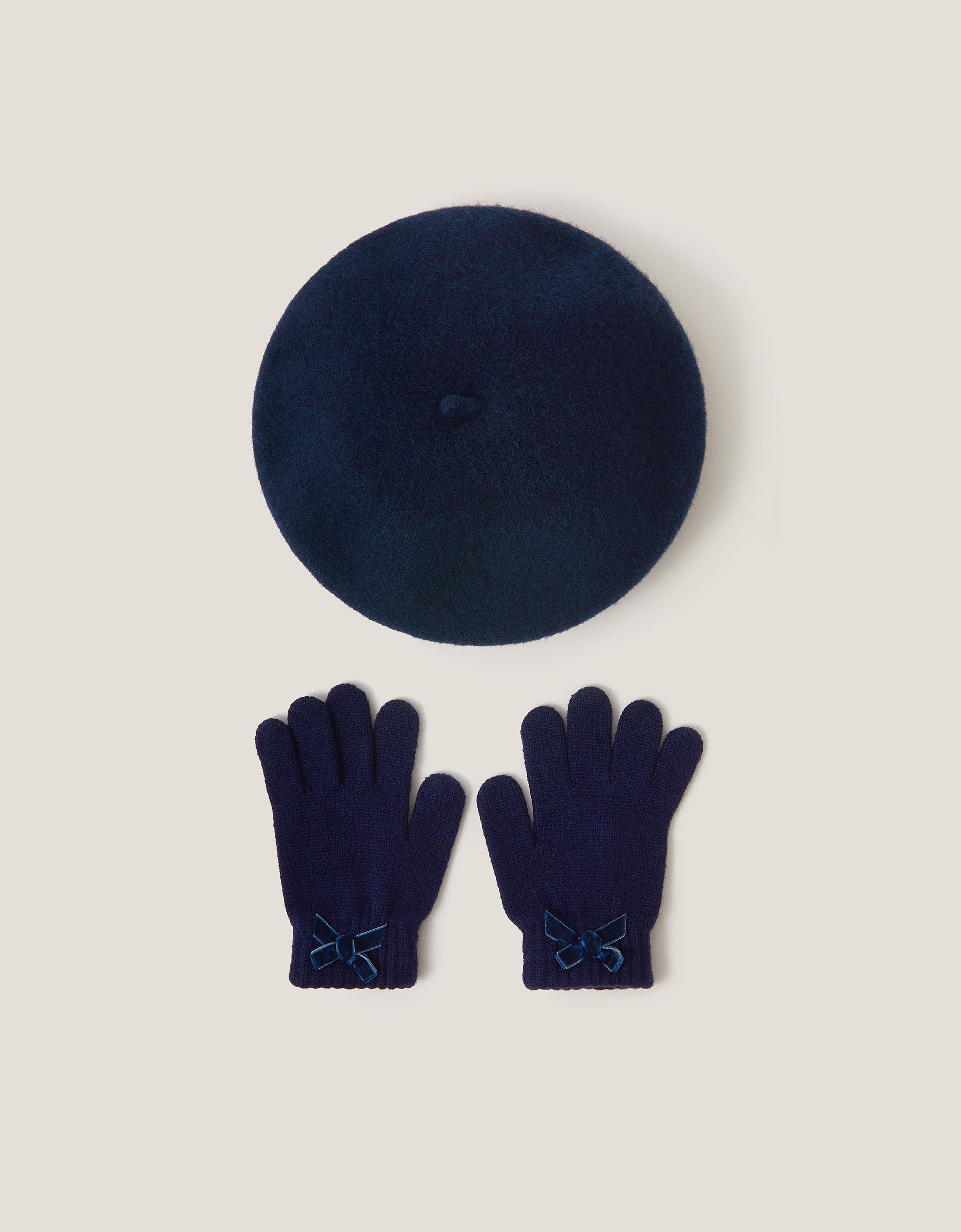 Monsoon Blue Bow Wool Beret & Gloves Set Plain, in Size: 10-13 Years