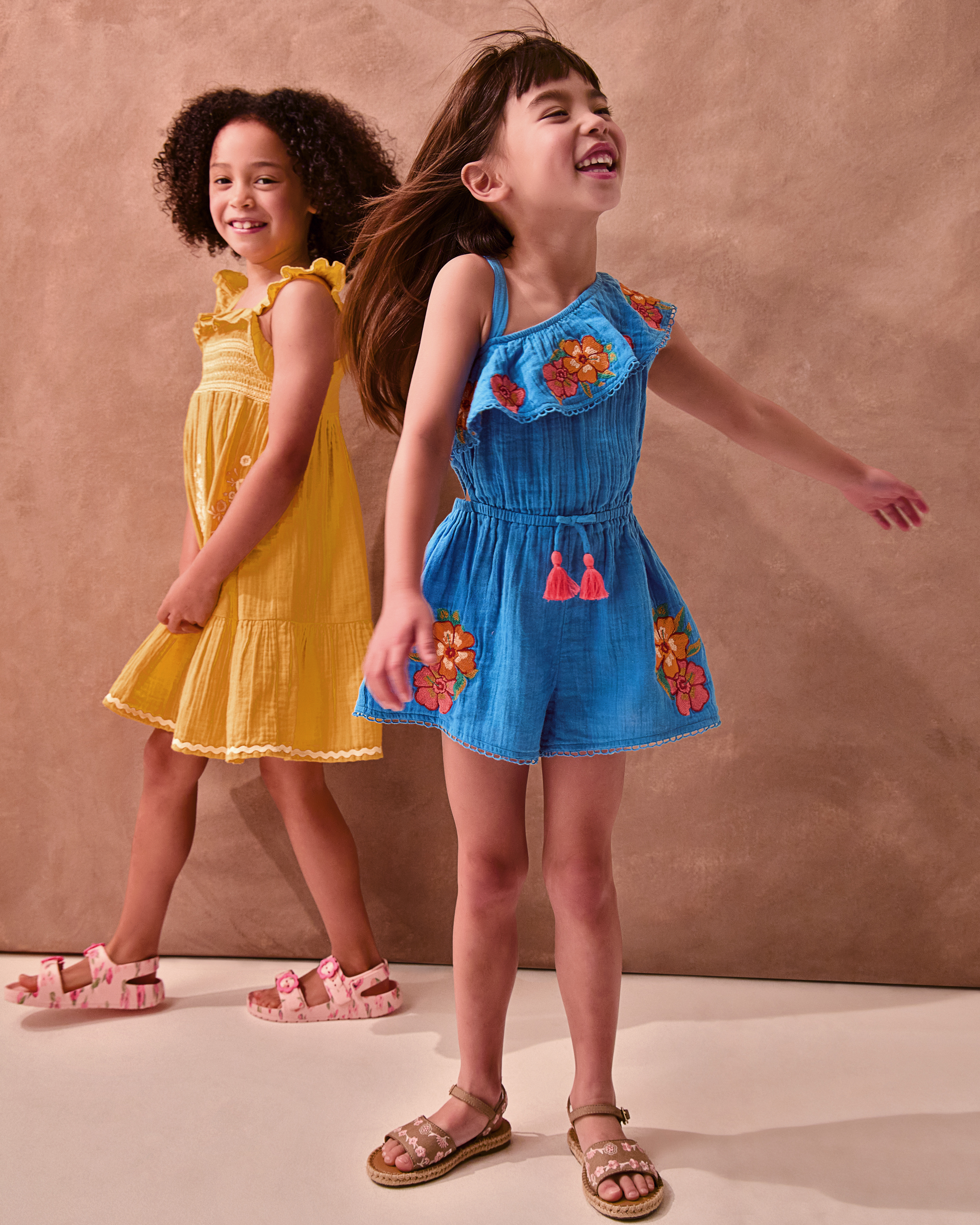 Flower power! Bursting with character and charm, this cotton playsuit is a fun addition to their summer collection. Embroidered with tropical blooms across the shoulder frill and shorts, it's perfect for BBQs, trips to the seaside and heatwaves at home. Complete with a stretchy waistband, it's equally comfy and stylish. Blue